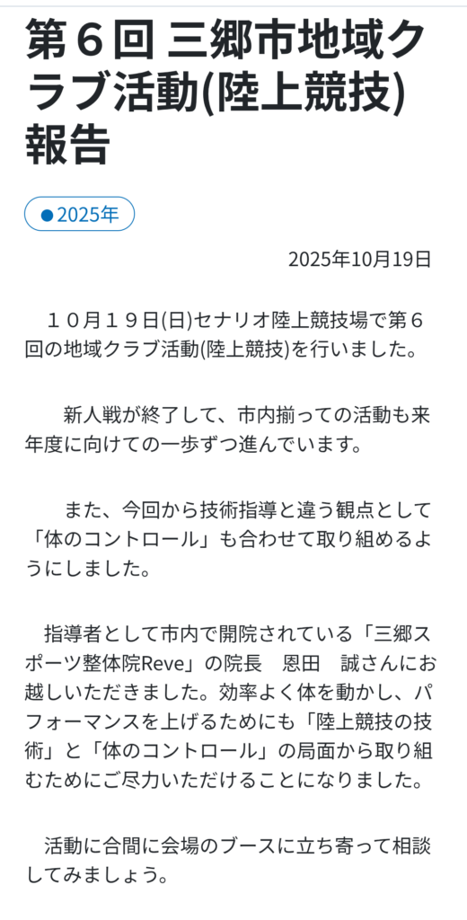 『スポーツの秋』ということで、先日ブース出店をしたみさとスポーツフェスティバル2025と、陸上の地域クラブ活動を行ってきました。